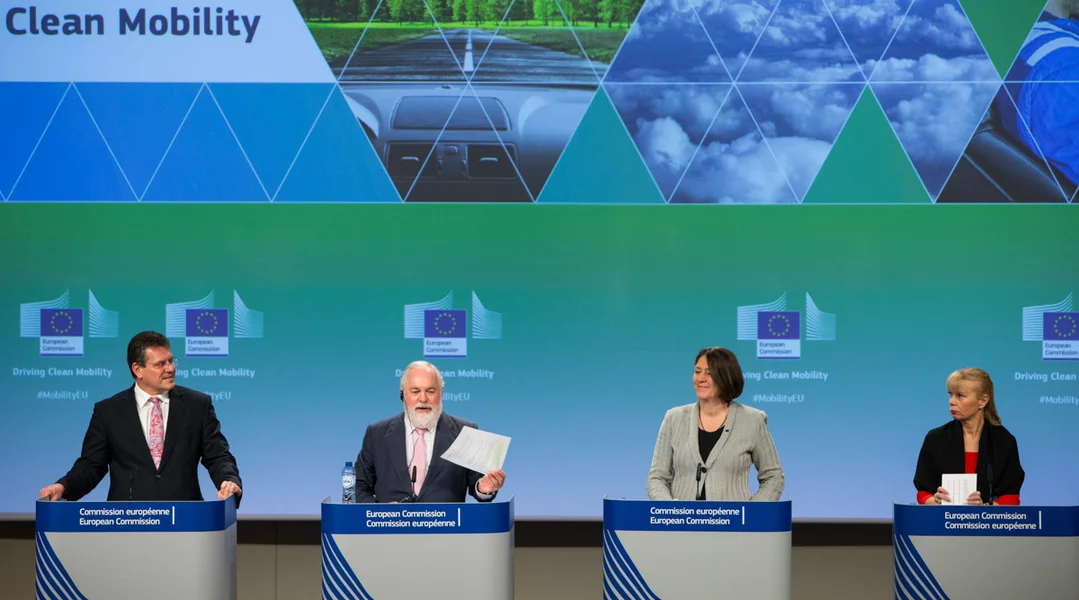 Direkt véier EU-Kommissäre stoungen um Podium, fir der Press déi nei Mesuren, déi fir méi propper Autoe suerge sollen, ze presentéieren. D'Bild soll eriwwer bréngen, wéi determinéiert dës Kommissioun ass, wann et ëm de Klimaschutz geet.