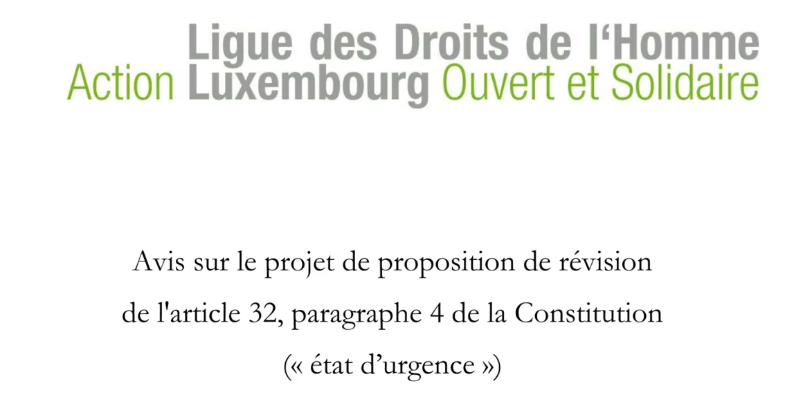 Fir hiren Avis auszeschaffen huet sech d'Mënscherechtsliga u Recommandatiounen orientéiert, déi viru Joren ausgeschafft gi sinn. D'Ligue kritiséiert beispillsweis, datt d'Propose fir den Artikel 32 Paragraphe 4 vun der Verfassung ze ännere keng explizit, formell Deklaratioun vum "état d'urgence" virgesäit, sou de President Claude Weber. Am aktuelle Verfassungstext an och am Revisiounsprojet "ass den 'état d'urgence' quasi ëmmer do. De 'pouvoir exécutif' kann ëmmer zu all Moment ee 'règlement d'exception' maachen", virausgesat d'Ëmstänn verlaangen et an d'Exekutiv stellt d'Urgence fest.