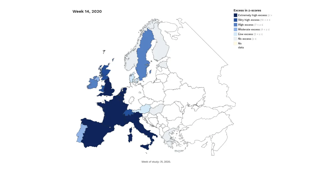 Den Héichpunkt gouf an der Woch vum 6. Abrëll erreecht, mat engem plus vu 60 Prozent am Verglach zur selwechter Woch an de fënnef Joer virdrun. Déi Entwécklung koum zwou Wochen nom Héichpunkt vun der éischter Well vun Infektioune mam neiaartege Coronavirus.