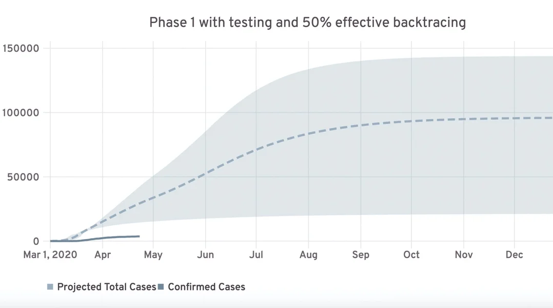 Wann den Traçage et erlaabt d'Hallschent vun den Ustiechungen ze detektéieren, fält d'Prognos nach besser aus: D'Zuel vun den Infektioune géif ënner 100.000 bleiwen, d'Zuel vun Intensivpatiente géif bis Enn Mee op maximal 55 klammen, a bis Enn des Joers wier mat 250 Doudesaffer ze rechnen.