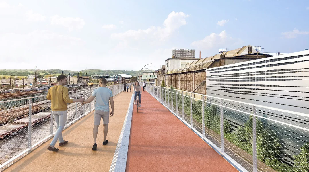 Den Ufank vun den Aarbechten ass am Hierscht vum nächste Joer. Enn 2022 soll d'Vëlospist fäerdeg sinn. De Wee geet iwwer den Terrain vun Arcelor Mittal a well een do wéinst de Schinne limitéiert ass, wäert d'Streck, déi Plaz fir Vëlosfuere a Foussgänger bitt, zum Deel iwwer eng Bréck goen.