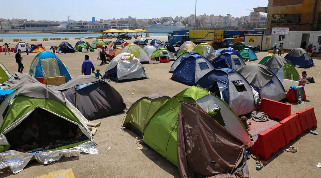 Um Hafe vun Athen, zu Piräus, waren zäitweis bis zu 10.000 Flüchtlingen a klenge Campingszelter direkt um Betonsbuedem ënnerbruecht. Et hu sou gutt wéi keng Duschen. D'Kanner spillen de ganzen Dag um Parking an der Sonn.