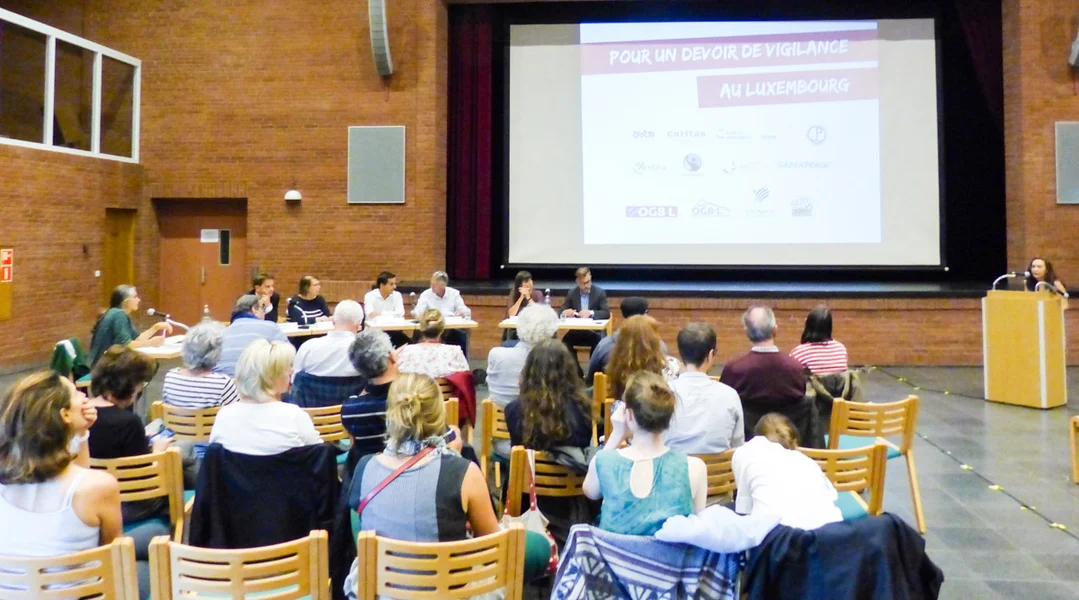 Et ass un der nächster Regierung en neien nationalen Aktiounsplang fir d'Ëmsetzung vun den UNO-Richtlinne fir Entreprisen a Mënscherechter auszeschaffen. Initiative pour un devoir de vigilence au Luxembourg wëllt hiren Drock oprecht erhalen, fir d'Aféierung vun enger gesetzlecher Suergfaltsflicht fir Entreprisen, mat contraignanten Normen, mat Kontroll a mat Sanktiounen.