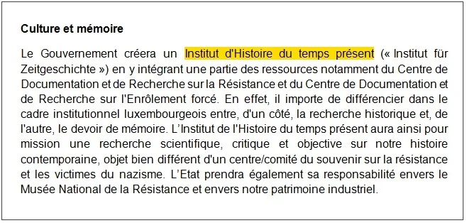 Genau déi Suerg huet de fréieren LSAP-Deputéierte Ben Fayot, dee sech derfir agesat hat, dass d’Institut fir Zäitgeschicht an de Regierungsaccord opgeholl gouf. Déi ursprénglech Propose vun der LSAP war, fir e klengt Institut fir Zäitgeschicht ze grënnen, dat onofhängeg vun der Uni funktionéiert. Dass d’LSAP sech ee klengt Institut baussent der Uni gewënscht huet, dat och vun LSAP-noen Historiker hätt solle geprägt ginn, streit de Ben Fayot of. Hien fuerdert elo, dass et dann op d'mannst bannent dem interdisziplinären Zentrum eng Entitéit mam Titel “Institut d’Histoire du Temps Présent” gëtt, déi eng gewëss Autonomie huet.