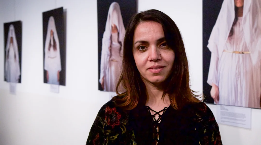Si sengt kurdesch traditionell "Lamentatiounslidder", währenddeem d'Gäscht roueg duerch d'Ausstellung ginn: D'Fotoserie portraitéiert eng Dose jesidesch Fraen, déi dem IS entkomme konnten, nodeems d'Terrororganisatioun déi jesidesch Héichbuerg Sinjar am Joer 2014 iwwerfall hat, an Dausende vu Frae versklaavt, verkaaft a mëssbraucht huet.
