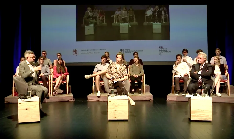 D'Ministeren hu mat jonke Leit aus däitschen, franséischen a lëtzebuergesche Secondaire's Klassen diskutéiert. D'Schüler ware invitéiert ginn, hir Froen zum Theema ze stellen.