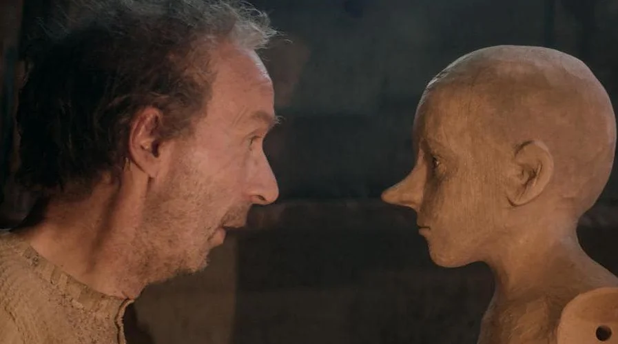 De Benigni verkierpert elo net méi selwer déi hëlze Marionett, mee där hire Papp, den Gepetto, dee sech säi Jong reegelrecht aus engem Stéck Holz schnëtzelt. Den Ufank vum Film steet ganz am Zeeche vum batter-aarmen toskanesche Schräiner, deem een nokuckt, wéi en sech dréint a kéiert fir sech eng Zëppchen offréieren ze loossen ouni mussen ze heeschen.
