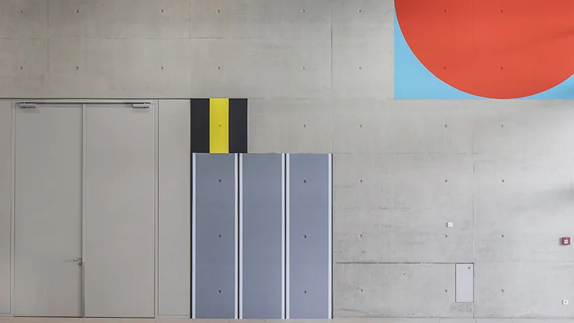 D'Architekten hätte ganz gär wäiss a gro. Am Kontext vun enger Schoul géif sech d'Fro opdrängen: "Feelt do net e bësse Faarf?" Mëttlerweil kéinte sech vill Leit de Couloir ouni seng Interventioun net méi virstellen, sou de Paul Kirps. Hien hätt bewosst architektonesch Elementer integréiert. Sou wéi d'Fënsteren, d'Dieren oder de Raster vun de Betons-Placken. "Ech benotzen déi Längten, déi Mossen, an interpretéiere se dann a mengen Aarbechten."