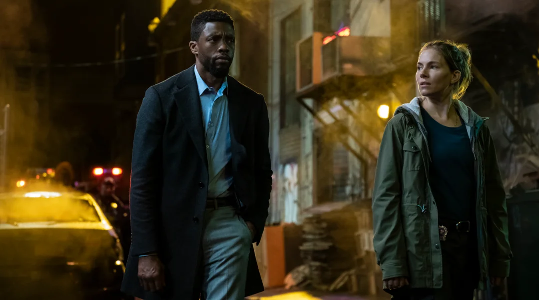 De Black Panther Boseman setzt e kredibelen amerikaneschen Accent drop - et vergësst ee bal, datt hie vu Wakanda ass - kritt an der Persoun vun der Sienna Miller mat New York Slang e Sidekick zur Säit gestallt an zesumme solle si déi zwee Krimineller fänken. An zwar an e puer Stonnen. Si hu bis fënnef moies Zäit. Eent, zwee, dräi - Manhattan a seng 21 Brécke ginn zougemaach. Kee kënnt eran a keen eraus. D'Auer tickt.