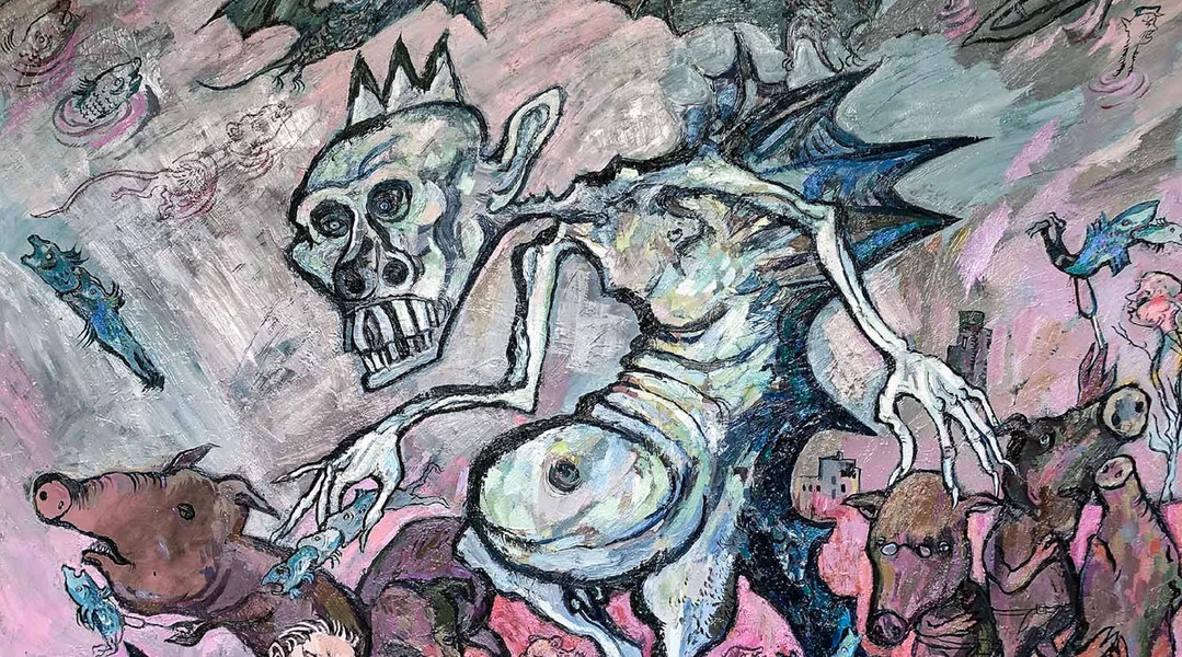 Mee wat ee méi no kënnt, wat ee méi Verzweiwlung an de Gesiichter vun de representéierte Massen entdeckt. Donieft Doudekäpp vun Déieren, Muschelen an aner Fossilien. Dertëscht ëmmer nees en Draach, deen dat absolut Béist duerstellt, ëmgi vu Schwäin, Flantermais, Eilen, Haien, mee och Hexen an entmënschlecht, onheemlech Wiesen."Ech nenne meng Ausstellung hei 'Le nouveau Bestiaire', well ech op eemol gefillt hunn, datt all déi al Monsteren, déi de Mënsch an der Vergaangenheet begruewen hat, nees operstane sinn", erkläert de Maxim Kantor.