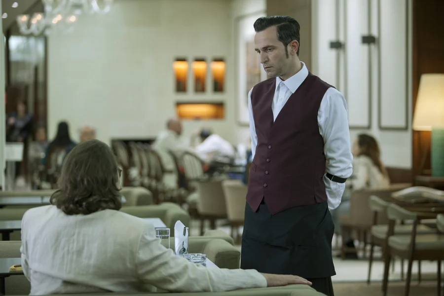 "The Waiter" lieft net zulescht vun der Konfrontatioun tëschent dem Serveur Renos (Aris Servetalis), eng Zort Buster Keaton, dee keng Minn verzitt, egal wat hie grad viru sech um Teller leien huet, an dem ambivalente Friemen (Giannis Stankoglu), deen eng faszinant a geféierlech Präsenz ausstraalt, gläichzäiteg verféiert an Angscht mécht, an de Renos aus senger Reserve lackelt. Déi flott jonk Fra (Chiara Gensini) tëschent den zwee Männer: gemeinsamen Unzéiungspunkt oder Mauer, déi eng latent Homosexualitéit andämmt?