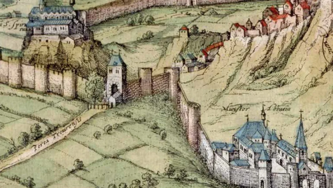 Um beléifte Wenzel-Tour sinn haut grouss Deeler vun der Wenzelsmauer ze gesinn, an natierlech och nach vill aner impressionant Elementer vun der aler, Lëtzebuerger Festung. Dorënner dann och vereenzelt Paarten an Tierm, duerch déi een deemools an d'Stad eran- oder erausgelooss gouf, wéi zum Beispill de Jacobs-Tuerm. Oder soll ech éischter Al Tréierer Paart soen, oder vläicht Dinsel- oder Dënselspaart? Dës Bezeechnunge féieren eis nämlech e gutt Stéck méi no un de Flouernumm Op der Rhum.
