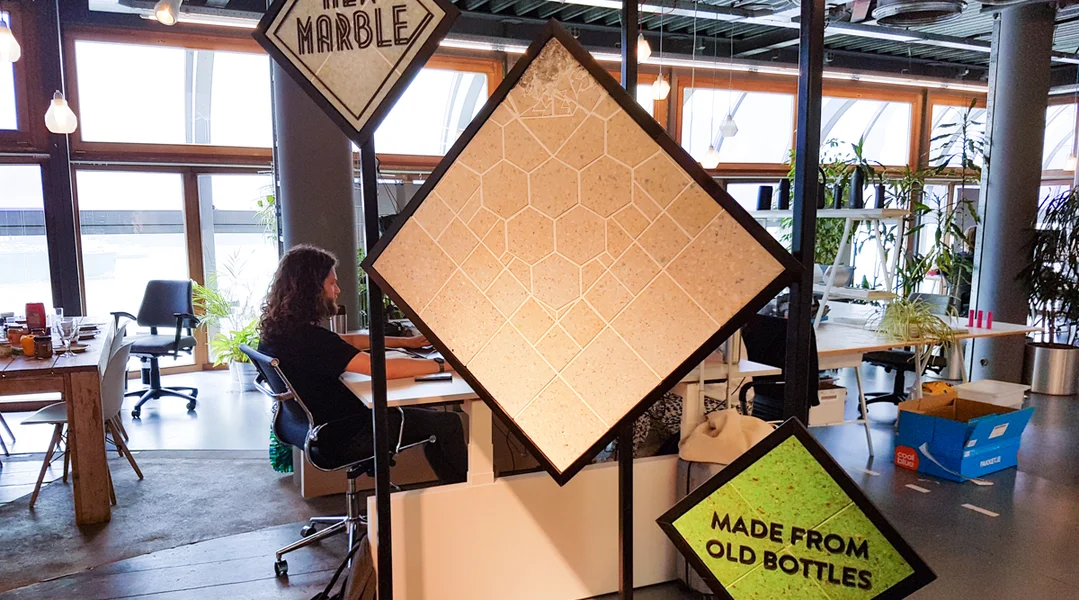 An där Partner an der Wirtschaft ginn et vill, d'Nofro ass grouss. Et sinn dacks Start-Uppe mat den innovativen Iddien. Et fänkt meeschtens schonn domat un, fir d'Material, dat benotzt gëtt, aus recycléiertem Offall hierzestellen. Sief et Firmen, déi den Offall aus de Kanäl vun Amsterdam fëschen, an dorausser Dëscher bauen, oder wéi d'Better Future Factory, déi aus PET-Fläschen, déi si op Museksfestival sammelen, nei Produite bastelen. Eng aner Approche ass et, biologescht Material hierzestellen, sou datt kee Plastik méi muss produzéiert ginn.