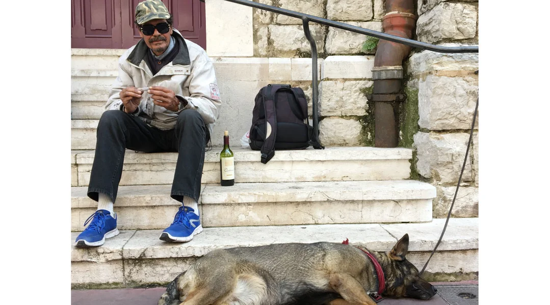 De Mustapha huet 52 Joer. Hie setzt direkt vis-à-vis vum Palais du Festival mat sengem Mupp an enger Fläsch roudem Wäin op enger Wiss. Seng Elteren hätten deemools keng Sue gehat fir him säi Psychologie-Studium ze bezuelen. Zënter 15 Joer géif hien elo op der Strooss liewen a vu Stad zu Stad goen. Säi Mupp heescht Roxanne. En Hommage un d'Lidd mam selwechten Numm vun der englescher Band "The Police".